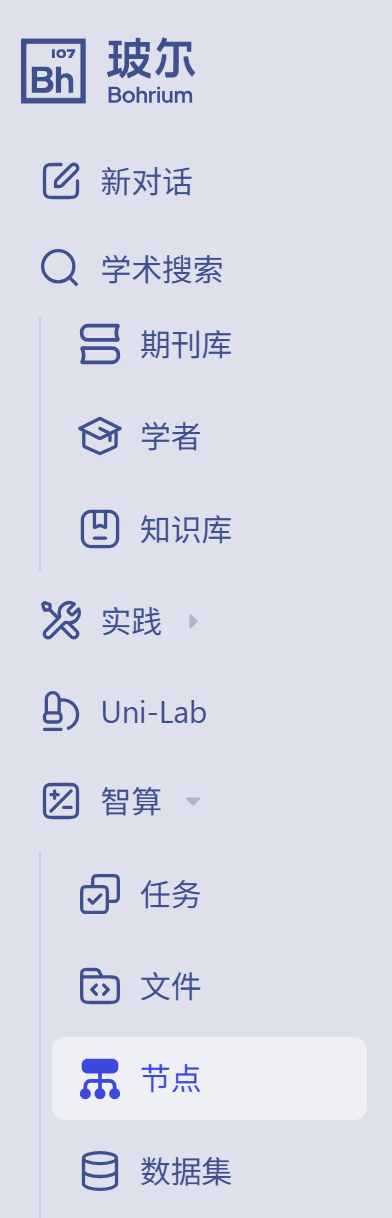 Bohrium 平台(https://www.bohrium.com/)上准备了丰富的软件镜像,我们可以通过创建容器节点的方式使用 Bohrium 为我们准备好的软件环境。创建了 Bohrium 的账号后,我们需要找到“智算”栏目下的“节点”。