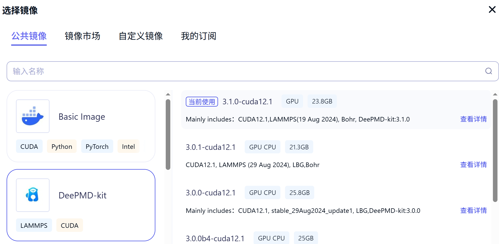 创建容器节点,取一个便于辨认的节点名称。之后,在“镜像”一栏,我们选择 DeePMD-kit 的 3.1.0-cuda12.1 版本。