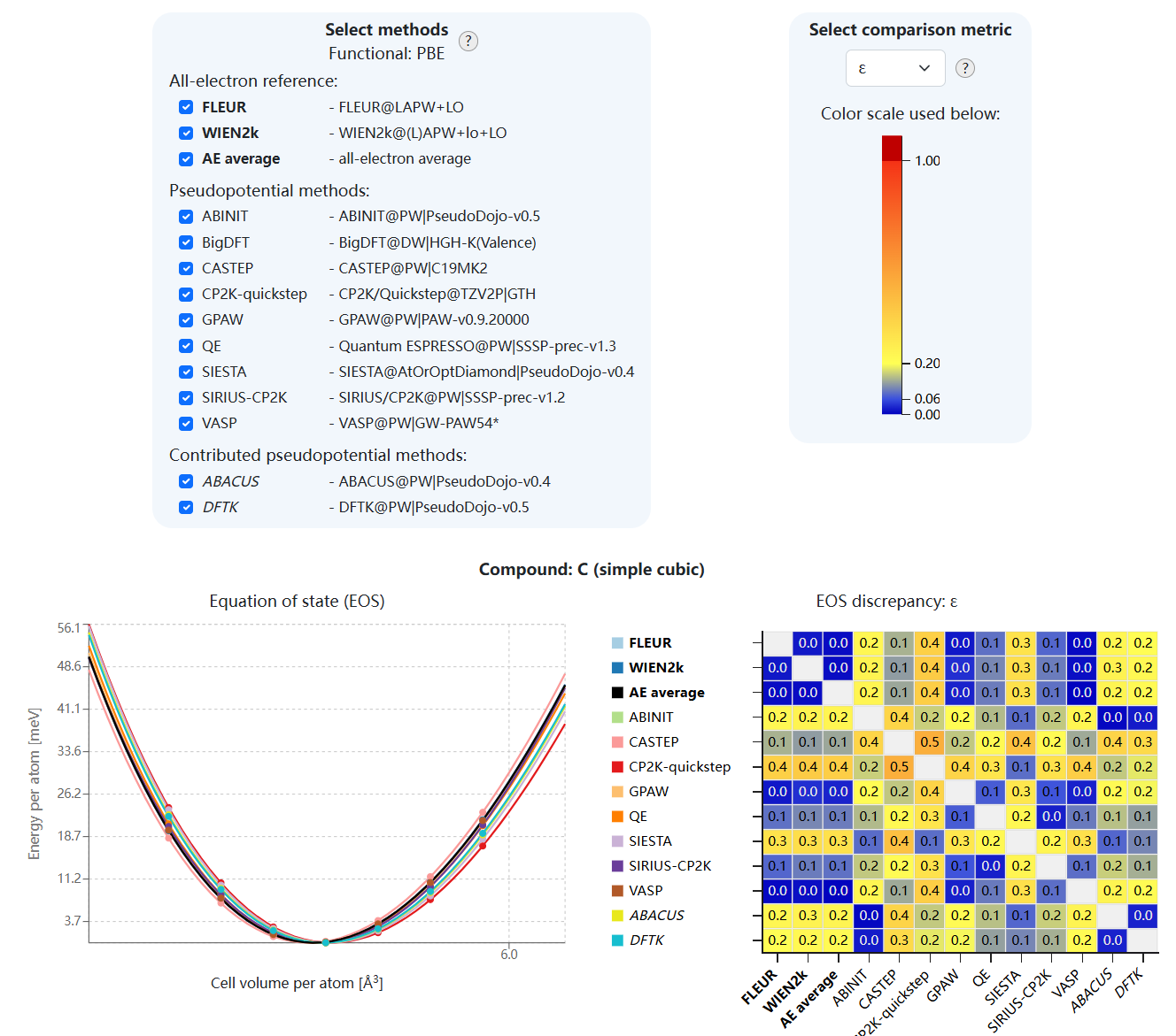 - 也可以对比基于赝势计算和全电子计算的差异。全电子参考数据集为 FLEUR 和 WIEN2k 的平均结果。