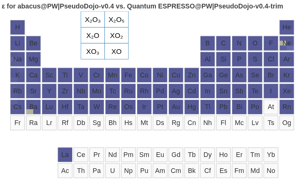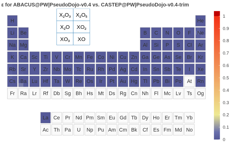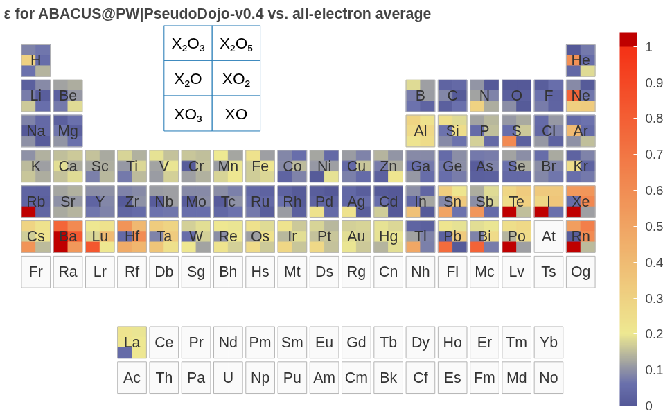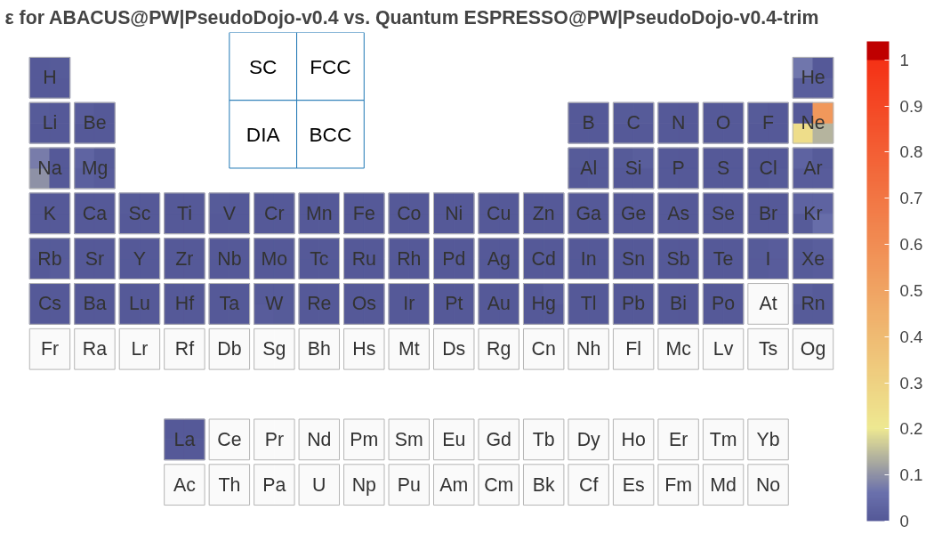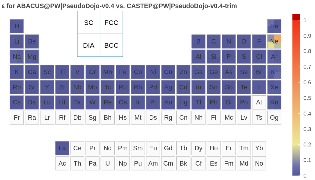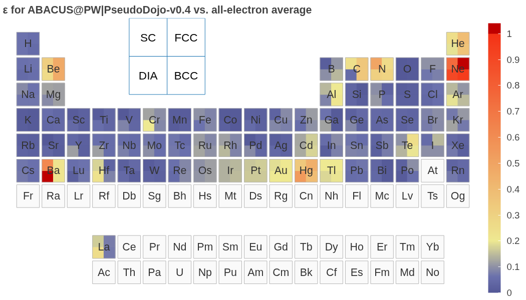 [!TIP] ABACUS 以上验证结果使用 PseudoDojo v0.4. 用户进行计算时,建议使用更为精确的 PseudoDojo v0.5(精度可参考 ABINIT 结果),新版本修正了 v0.4 中部分元素(如 Ba)偏差较大的问题(In the v0.5, the following elements have been updated: Ba, Bi, I, Pb, Po, Rb, Rn, S, Te, Tl, and Xe.),详见 https://www.pseudo-dojo.org/index.html。