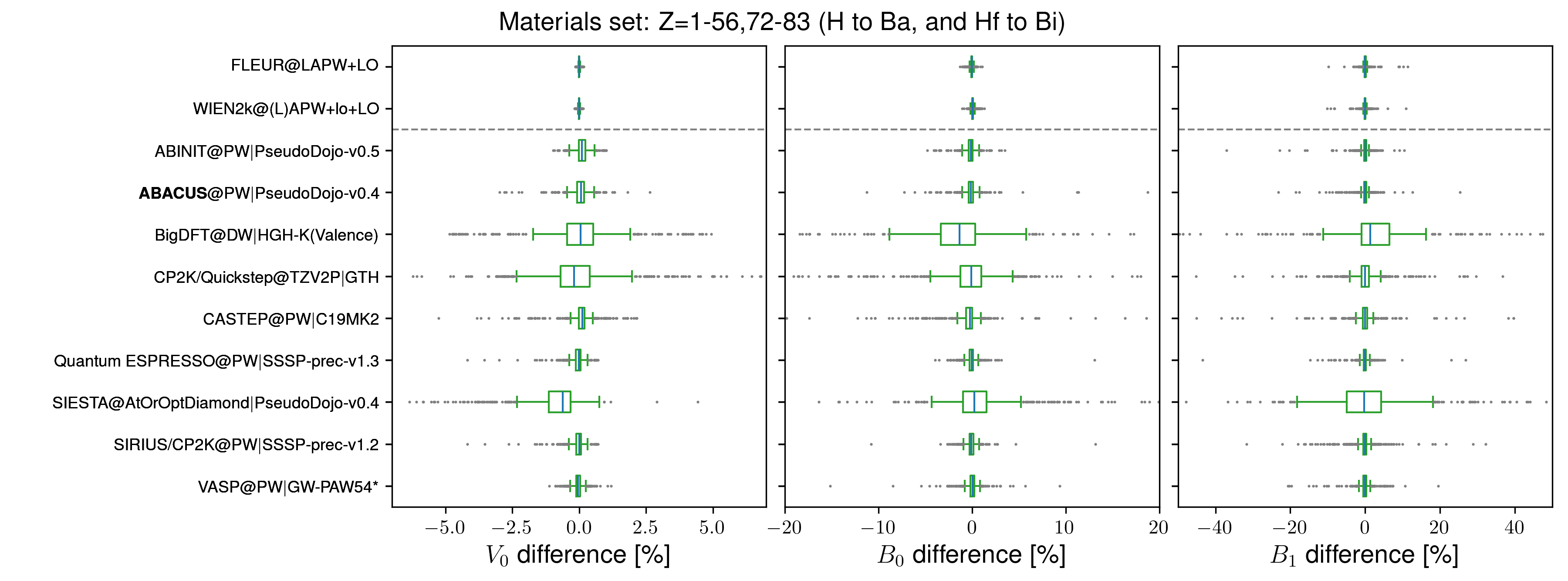 - 对于计算结果拟合得到的几个参数$V_0$、$B_0$和$B_1$绘制 box-and-whisker plot 箱线图,直观表明计算结果相对平均全电子参考数据集(Average all-electron(AE) reference dataset)偏差的分布,观察中心位置,离散程度和离群值。