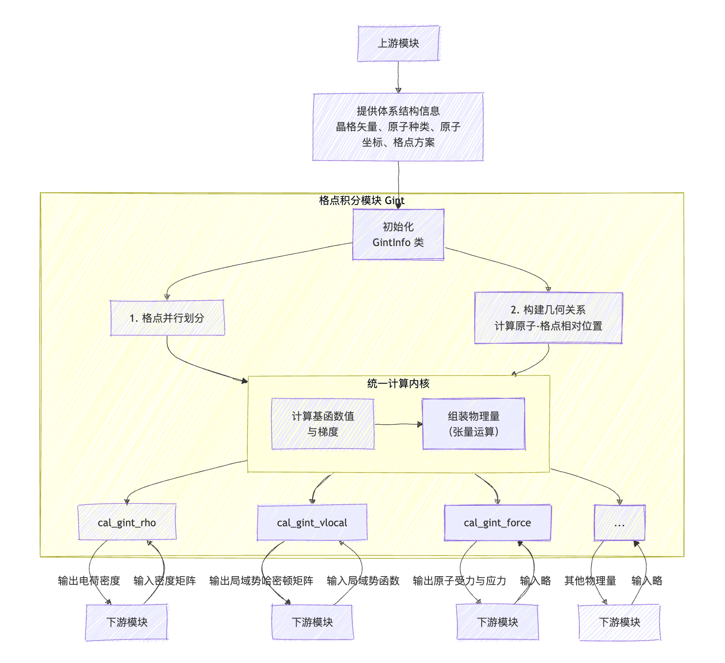 Gint 模块正是为实现这一核心计算流程而设计的模块,它负责所有依赖于实空间格点积分的物理量的统一计算。