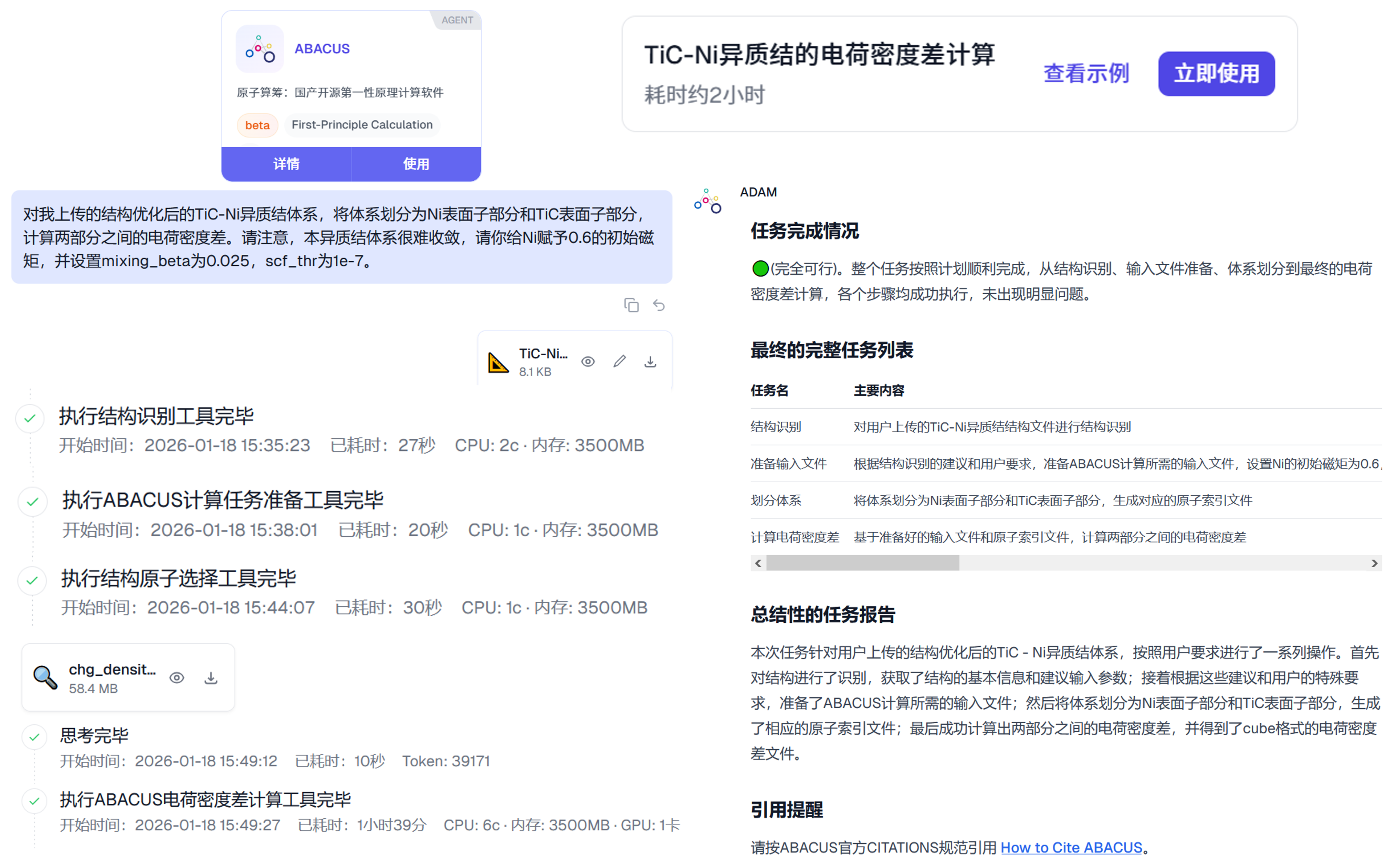 下图图示了基于 GaliLeo 科学智算平台,通过自然语言驱动,AI 智能体自主开展的 TiC-Ni 异质结体系的电荷密度差计算过程。