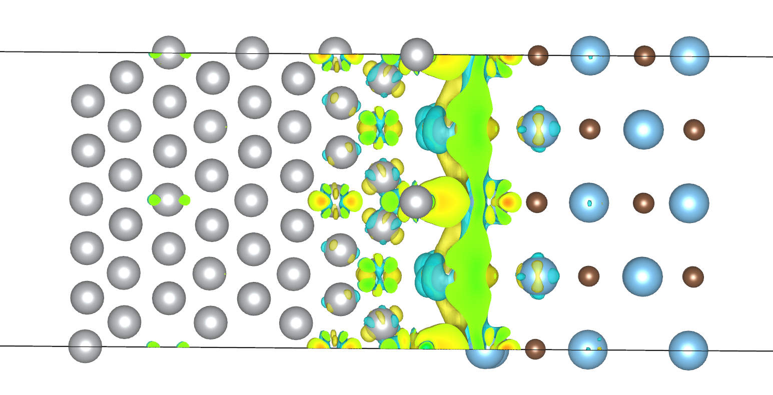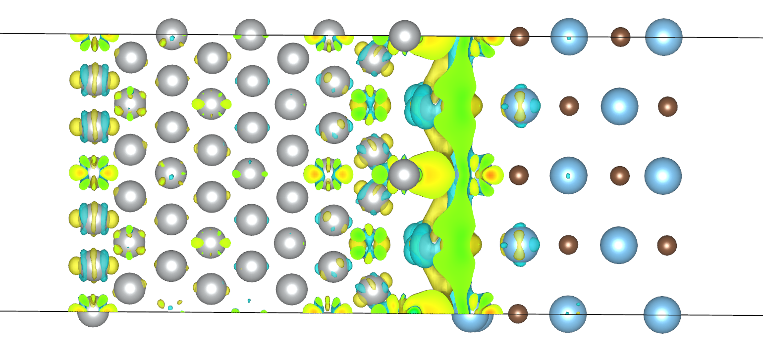 异质结体系是指由两种或两种以上化学组分、晶体结构或电子性质不同的材料通过界面接触形成的复合体系,其核心特征是存在明确的异质界面,区别于由同种材料构成的同质结(如单晶硅 pn 结)。异质结是光电器件、催化材料、储能材料等领域的核心结构(如石墨烯 / 氮化硼范德华异质结、钙钛矿 / 硅太阳能电池异质结)。其结构决定了其计算的复杂性。针对这类体系,可通过电荷密度差(charge density difference, CDD, 又称差分电荷密度)计算,直观地展现界面处的电荷重新分布。